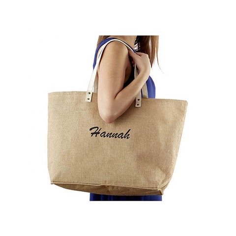 Toptan üretici kadınlar jüt alışveriş çantası özel Logo deri saplı geri dönüşümlü plaj çantası alışveriş çantası